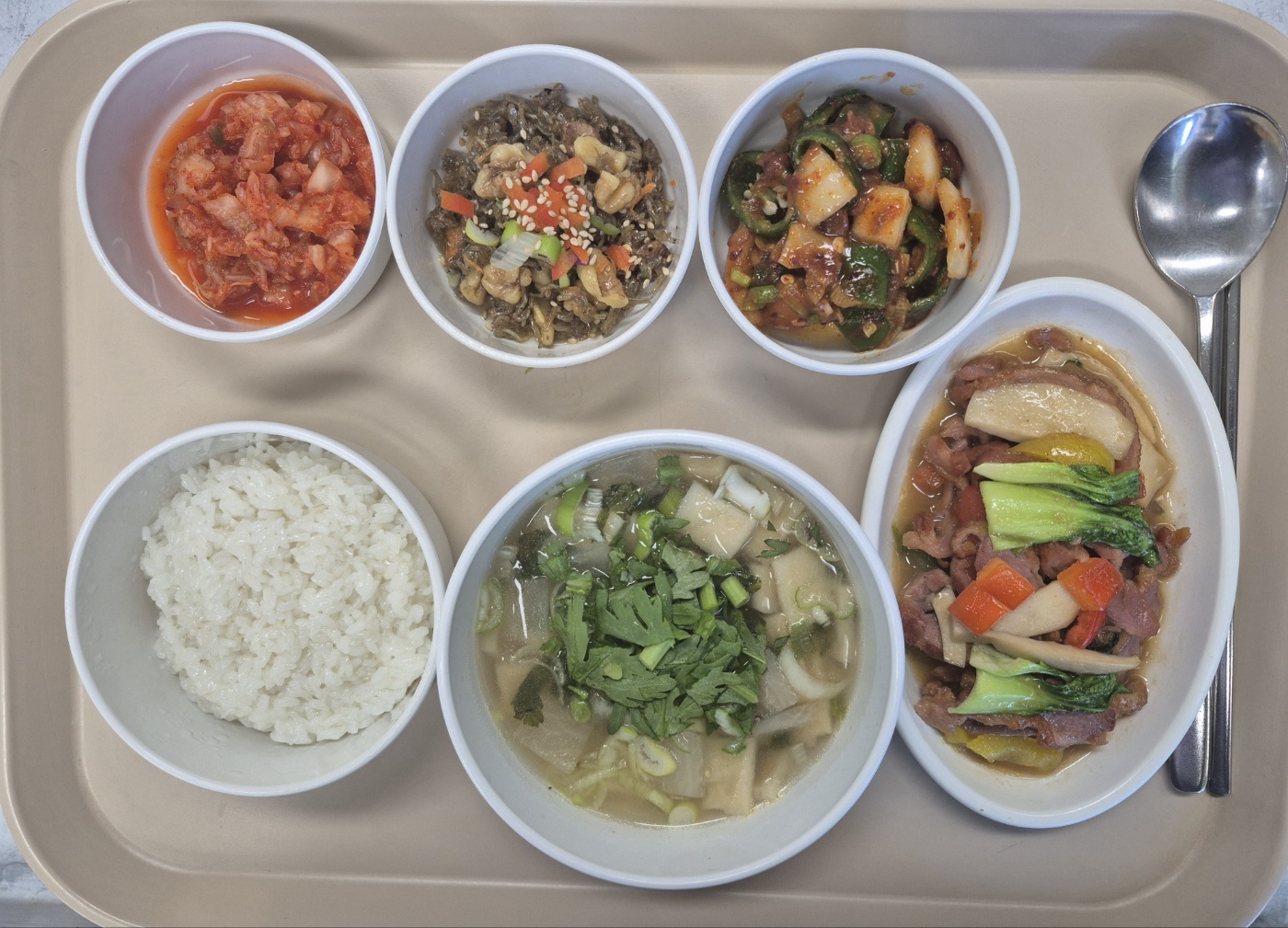 어묵무쑥갓국, 훈제오리야채찜, 멸치견과류볶음, 아삭이고추쌈장무침