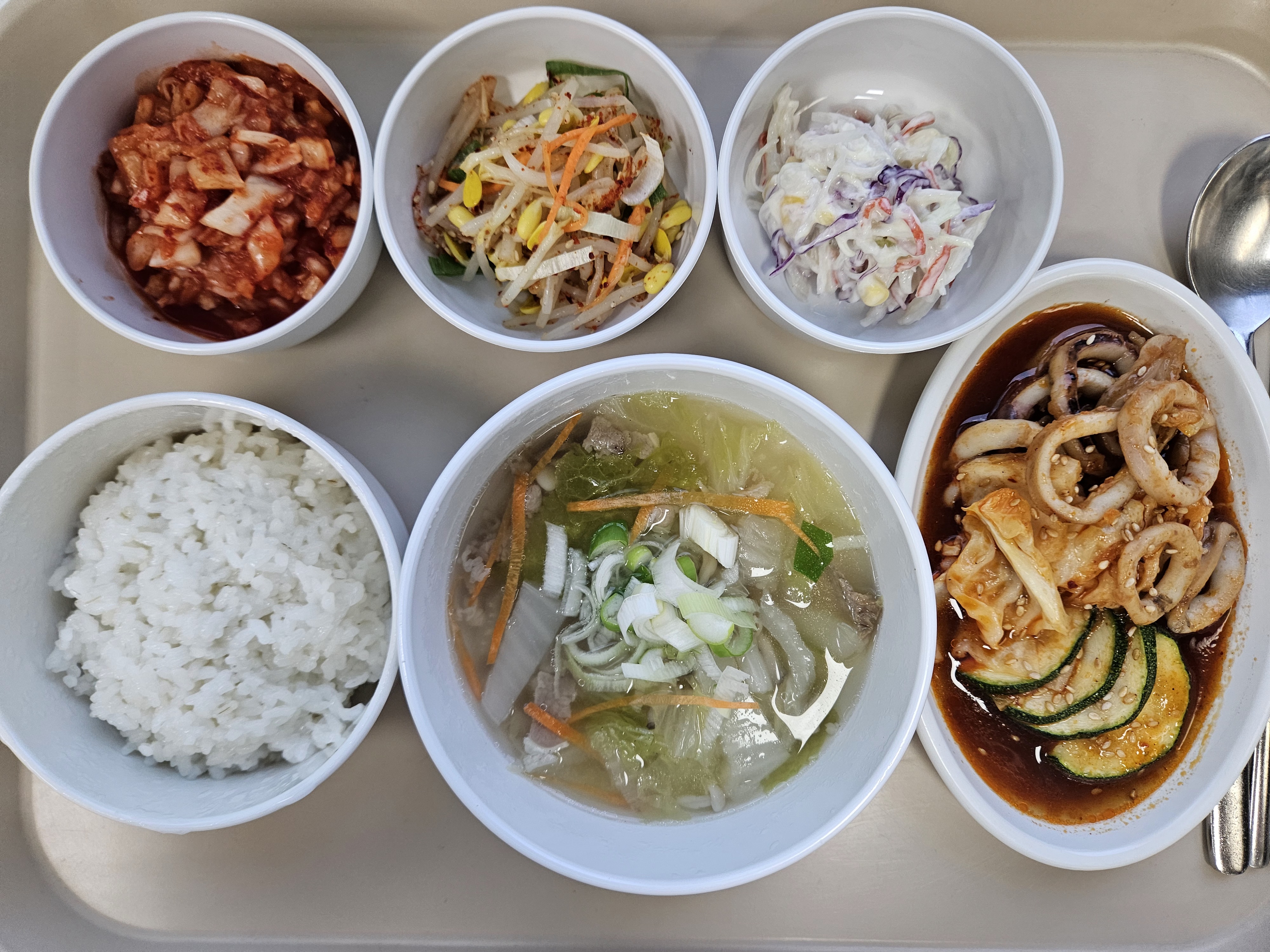 흰밥, 버섯샤브국, 오징어야채볶음, 콩나물무침, 크래미맛살샐러드 ,포기김치